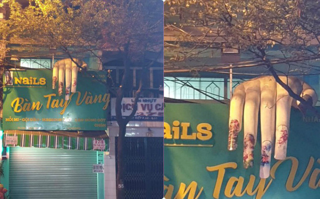 Chẳng là một cô nàng đi ăn đêm về rồi giật mình ngay sau khi thấy biển hiệu. Cửa hàng làm móng nên dùng một bộ móng tay lớn trang trí. Bàn tay khổng lồ với những chiếc móng dài, trang trí hoa văn đặt ngay phía trên nhìn cực kỳ nổi bật.