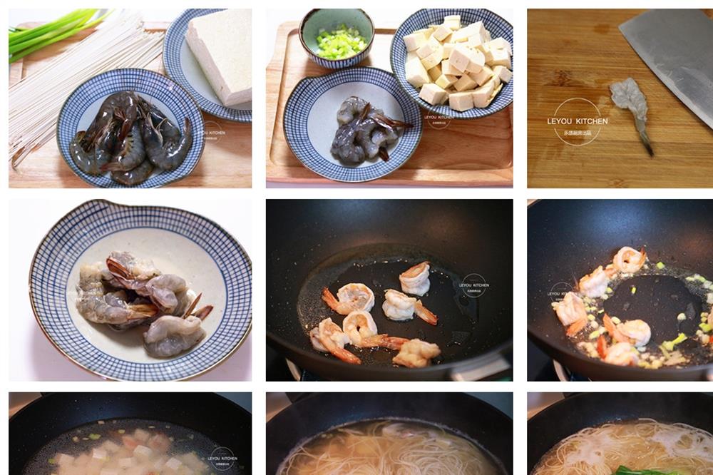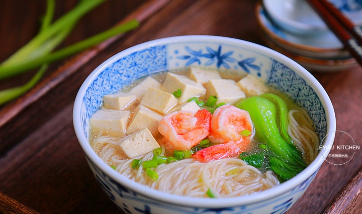 Chuẩn bị nguyên liệu: 6 con tôm tươi, 1 miếng đậu phụ, cải chíp, mì khô, hẹ hoặc hành khô, hành lá và gừng vừa đủ.