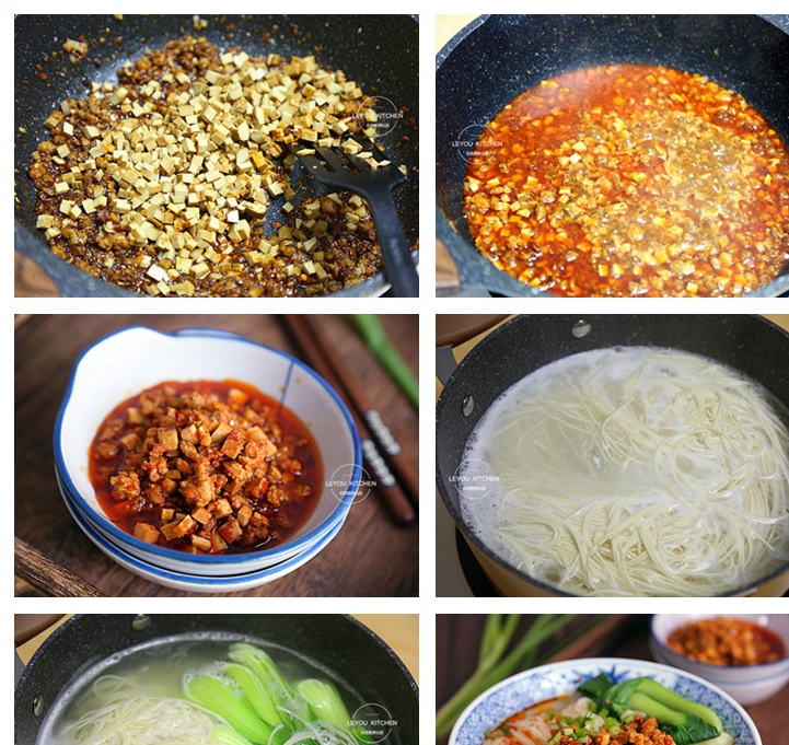 - Khi mì khô và cải ngọt đã chín, bạn tắt bếp, gắp mì ra bát, đổ thịt đã xào đậu khô vào, rưới một ít súp nóng lên trên là có thể thưởng thức.
