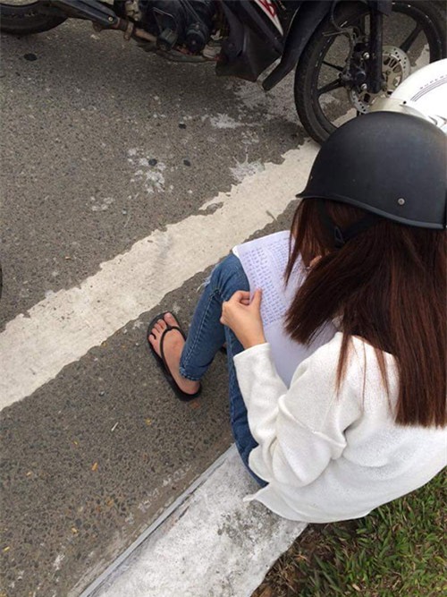 Hai cô gái ngồi bên đường và thực hiện yêu cầu chép phạt - (Ảnh: Tôi yêu Đà Nẵng)