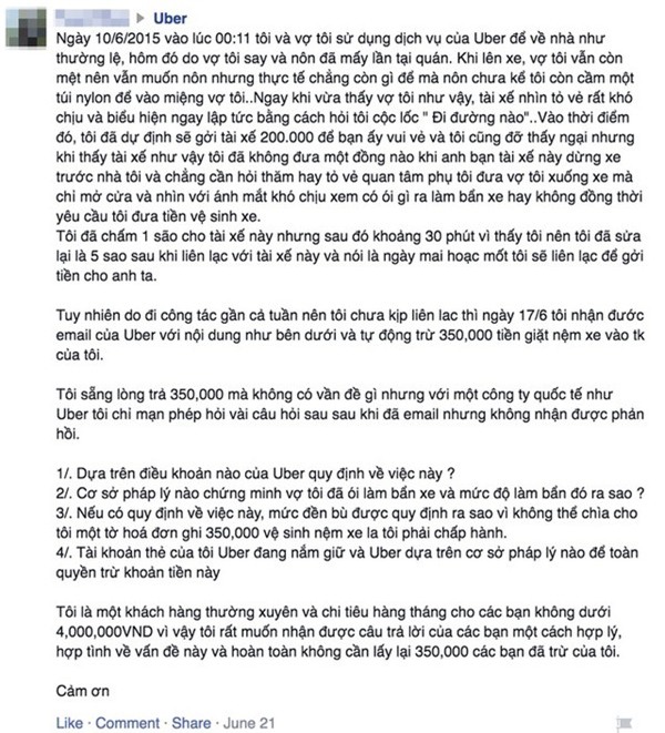 Mới đây, anh Tuấn - một hành khách đi Uber Việt Nam đã bị trừ 350 nghìn VNĐ vì đại diện hãng cho rằng khách đã nôn ra xe. Uber cũng thông báo ngừng cung cấp dịch vụ đối với hành khách này. Tuy nhiên, sau khi sự việc xảy ra, anh Tuấn đã thẳng thắn bày tỏ sự bức xúc về cách hành xử của hãng trên fanpage Uber.