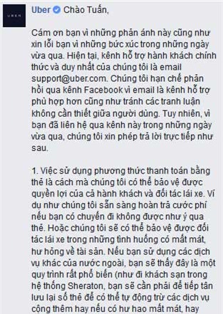 Nguyên văn nội dung trả lời trên fanpage của đại diện Uber: