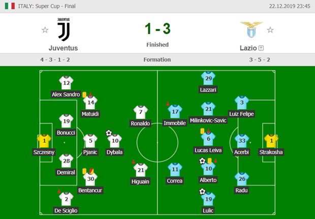 Tung ra đội hình tối ưu nhưng sau hơn 90 phút tranh tài, Juventus phải nhận thất bại tâm phục khẩu phục 1-3. Luis Alberto (16'), Senad Lulic (73'), Danilo Cataldi (90') là những người lập công cho Lazio. Trong khi bàn thắng duy nhất của Juve được ghi do công của Paulo Dybala ở cuối hiệp 1.