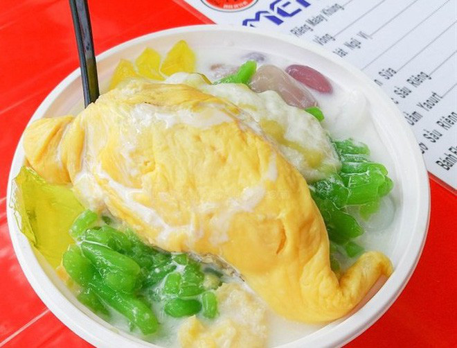 Vẫn là các loại thạch, trái cây, sốt quen thuộc, nhưng điểm sáng của món chè này chính là múi sầu riêng nguyên miếng vàng ươm, hấp dẫn. Và thế là dù ăn chè nhưng bạn vẫn thỏa mãn với múi sầu ngon lành, cắn ngập răng. Một bát chè sầu riêng như thế, giá từ 40 đến khoảng 80 ngàn đồng, không rẻ nhưng với tín đồ của sầu thì rất đáng.