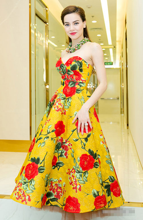 Xuất hiện trong một sự kiện Hồ Ngọc Hà tỏa sáng và thu hút mọi ánh nhìn với váy họa tiết hoa to màu sắc nổi bật.