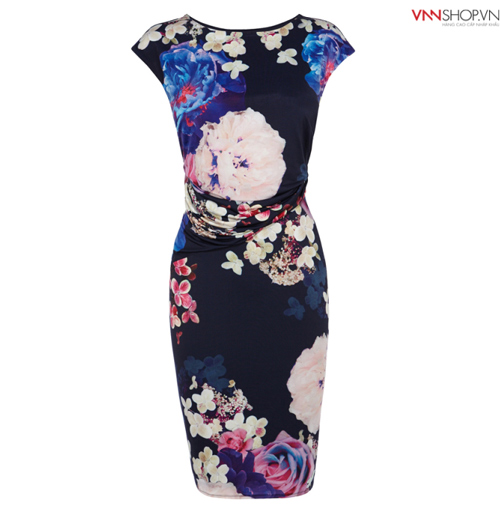 Váy họa tiết hoa to trên nền xanh navy tối màu của thương hiệu thời trang Coast mang đến cho quý cô vẻ đẹp thanh lịch, sang trọng.