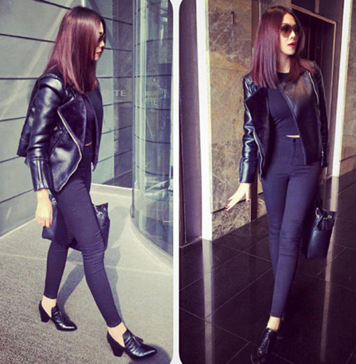 Thanh Hằng khẳng định gu thời trang cá tính với áo da đen dáng ngắn mix cùng quần skinny ôm sát.