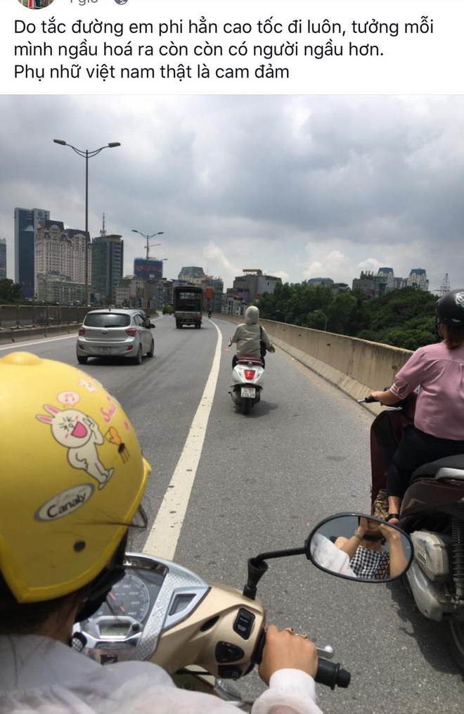 Lý do được đưa ra là do tắc đường, thế nên chị ninja kể trên mới sáng tạo "đi hẳn lên cao tốc" chạy cho nhanh. Thế nhưng chị này đã không hề cô đơn và tỏ ra đôi chút "thất vọng" khi tại thời điểm đó còn xuất hiện thêm 2 chiếc xe khác cùng 2 phụ nữ cũng "ngầu" như chị.