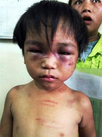 Bà Lưu Thị Bích Hợp, Phó Chủ tịch UBND P. Tân Hưng (Q.7) cho biết, cách đây 1 tuần, cháu Trịnh Nguyễn Thành Đức đã bị Hòa và Cường dùng ống nhựa, thuốc đang cháy đánh, chích một cách tàn nhẫn. Cháu Đức bị sưng húp cả mặt, mắt không mở ra được. Các vết đánh rớm máu trên khắp cơ thể.