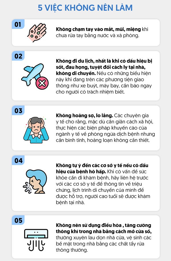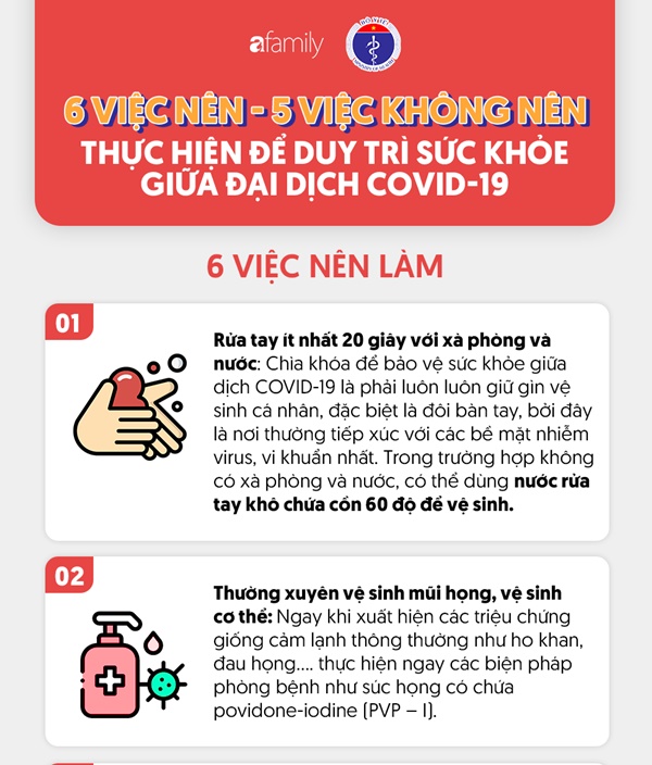 Để phòng mắc COVID-19, người dân cần tuân thủ các hướng dẫn phòng bệnh của ngành y tế và thực hiện nghiêm các quy định giãn cách xã hội. Dưới đây là những điều Bộ Y tế khuyến cáo người dân nên và không nên làm để bảo vệ sức khỏe trong cơn đại dịch.