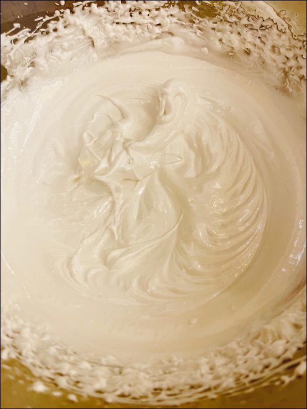 - Cho dung dịch đường vừa nấu (còn nóng) vào tô đựng lòng trắng trứng điều này giúp lồng trắng trứng được chín theo, đánh hỗn hợp trứng đường ở tốc độ trung bình. Khi thấy hỗn hợp trắng mượt và có bóng nhỏ li ti thì chỉnh đánh ở tốc độ cao cho đến khi hỗn hợp sánh mịn, kéo dụng cụ đánh lên tạo chóp nhọn thì ngừng lại ngay.