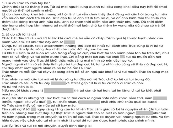 “Chắc bắt đầu từ câu nói từ trước khi cưới mà tôi vẫn cố chấp: ‘Anh quá lệ thuộc hạnh phúc của mình vào em, cứ như thế này anh sẽ ch**'. Đúng, tôi bị attach (Rối loạn phản ứng gắn bó), toxic attachment, những thứ đẹp đẽ nhất tôi dành cho Trúc cũng là vì tôi tự chọn bạn làm lý do sống duy nhất của cuộc đời này sau ba mẹ.