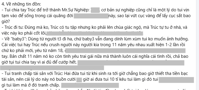Trong bài viết này, Đích Lép cũng phủ nhận thông tin chia tay vì sự nghiệp, vì Tizi đi tu. Đồng thời, anh cũng lên tiếng về tin đồn có người thứ 3: "Bản chất 11 năm nó không còn tình yêu trai gái nữa mà thành luôn cái nghĩa cái tình rồi, chả bao giờ tụi mìnhchia tay vì ai đủ để cướp hết", anh chàng chia sẻ.