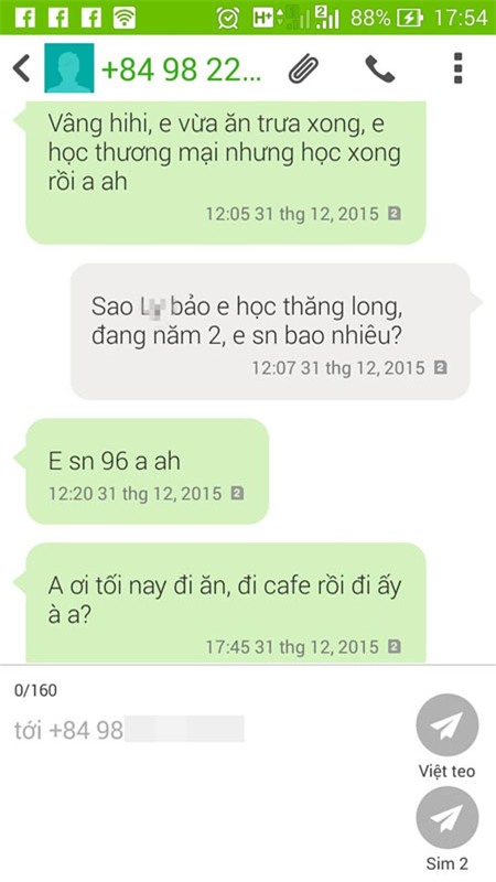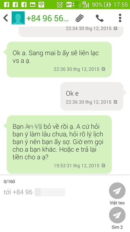 Những tin nhắn trao đổi giữa PV và cô gái An V để lên kế hoạch đi chơi tối 31.12 (trái) và tin nhắn PV trao đổi với L sau khi An V “thấy động”bỏ về. Ảnh: H.Đ |