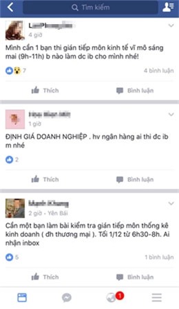 Rất nhiều lời rao tìm người học, làm bài tập và thi hộ trên facebook.