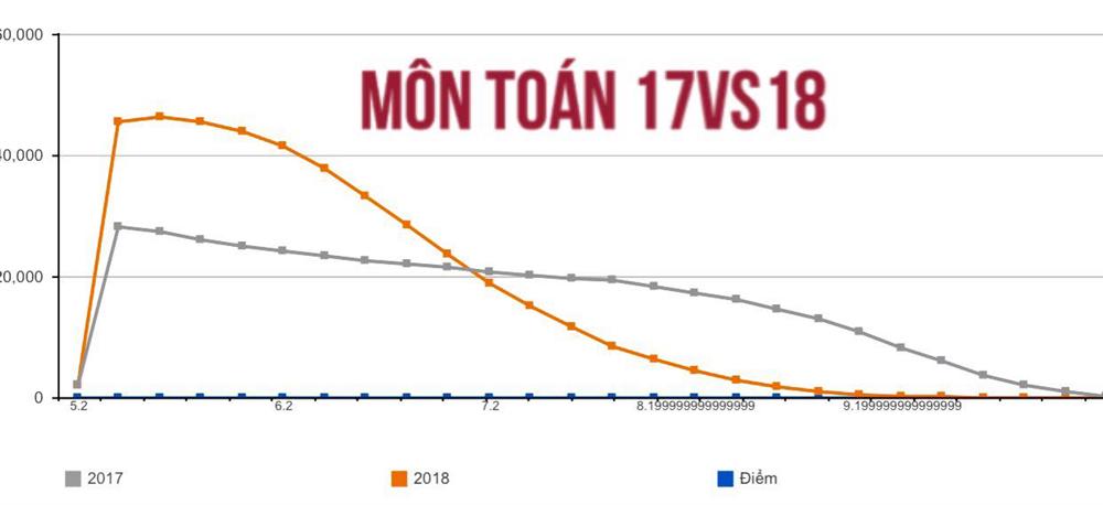 Đối với môn Toán, điểm giao nhau giữa hai đồ thị nằm ở mức là 7. Nếu năm 2017 số lượng thí sinh từ 7 trở lên nhiều và giảm dần thì năm nay số thí sinh từ 7 trở lên giảm rất mạnh.