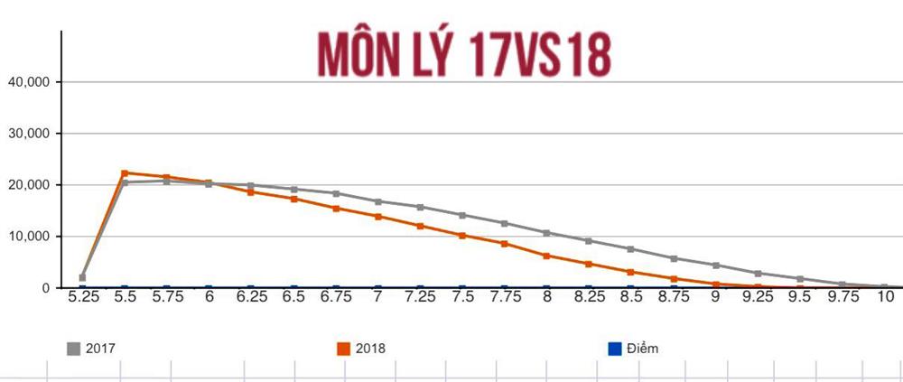 Môn Lý, điểm giao nhau giữa hai đồ thị là 6, nhưng số thí sinh từ 6 điểm trở lên giảm so với năm trước đó rất nhiều.