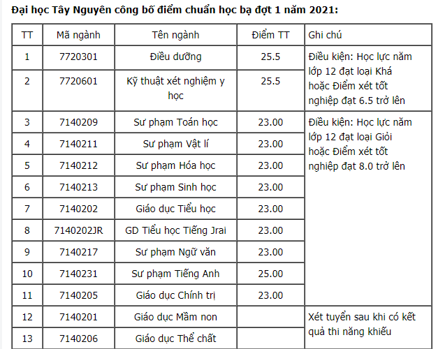 Hội đồng tuyển sinh Trường Đại học Tây Nguyên công bố mức điểm trúng tuyển và danh sách đủ điểm trúng tuyển theo phương thức xét học bạ đợt 1 năm 2021 như sau: