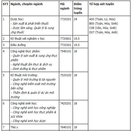 Theo đó, đối với cả hai phương thức xét tuyển, điểm trúng tuyển ngành Dược là 24 điểm, các ngành Kỹ thuật xét nghiệm y học và Điều dưỡng là 19.5 điểm, đồng thời thí sinh cần đạt quy định của Bộ GD&ĐT về điều kiện xét tuyển dành cho nhóm ngành Khoa học sức khỏe. Tất cả các ngành còn lại có mức điểm trúng tuyển là 18 điểm.