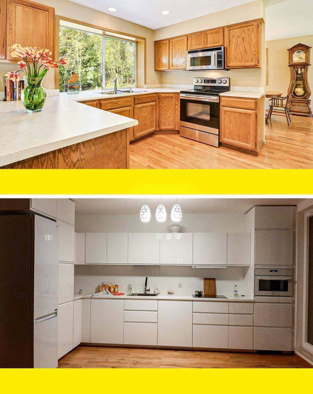 2. Nhà bếp sơn màu sáng hoặc tủ bếp bằng gỗ