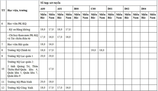Điểm sàn của 18 trường quân đội như sau: