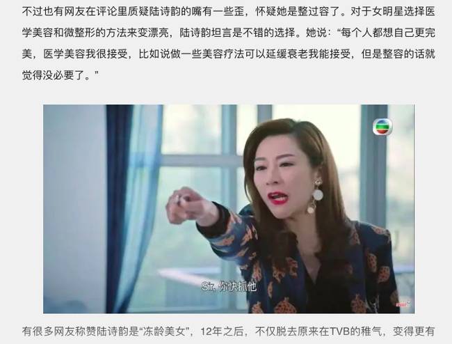Tuy nhiên, trong 1 số cảnh quay gào thét, Lục Thi Vận lại bị sọi khuôn miệng méo mó lạ kỳ. Giới truyền thông Hoa ngữ cho rằng đây là tác dụng phụ của việc phẫu thuật thẩm mỹ quá đà. Vì muốn duy trì tuổi xuân, Lục Thi Vận đã sử dụng đến dao kéo. Chính điều này khiến cho khuôn miệng của Á hậu Hồng Kông bị xô lệch 1 cách khó hiểu.