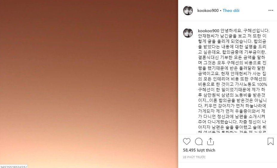 Trong bài đăng của mình, Goo Hye Sun đã phản pháo lại những thông tin mà Ahn Jae Hyun đề cập trong bài viết của mình, cụ thể là chuyện mà cô yêu cầu chồng cũ phải đưa tiền chu cấp sau khi ly hôn.