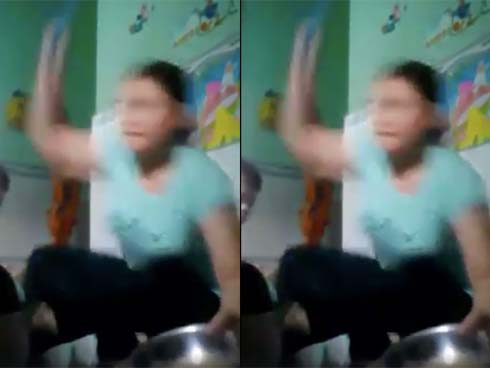 Mặc dù các bé gào khóc nhưng bảo mẫu vẫn cố "nhét" thức ăn vào miệng trẻ trông rất dã man. Trong khi đó, một bảo mẫu khác đứng gần đó nhưng chẳng có phản ứng gì. Thậm chí, có người còn đưa khúc cây nhựa cho bảo mẫu này đánh đập một bé.