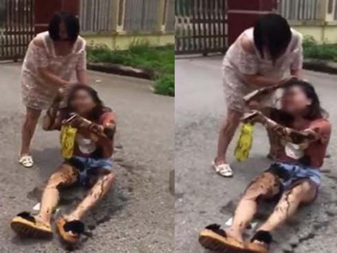 Lúc này, một người phụ nữ khác đi cùng người vợ cầm hỗn hợp dầu luyn và mắm tôm hất vào người và đầu nữ sinh. Sau đó người vợ lại túm tóc và tát vào mặt cô nhân tình.