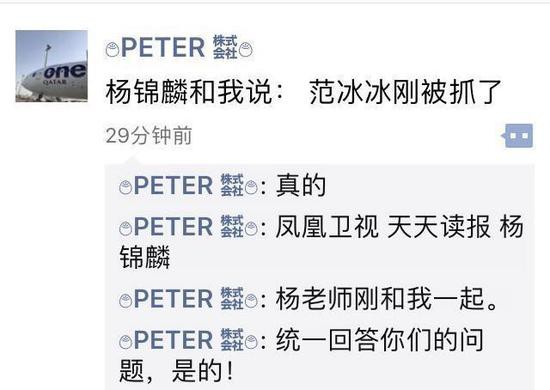 Khi được hỏi về vấn đề này, Dương Cẩm Lân nói ông không biết ai đã truyền tin Phạm Băng Băng bị bắt ra ngoài, chuyện này không liên quan gì đến ông ta. Và ông cũng không hề quen người có nick PETER ở trên.