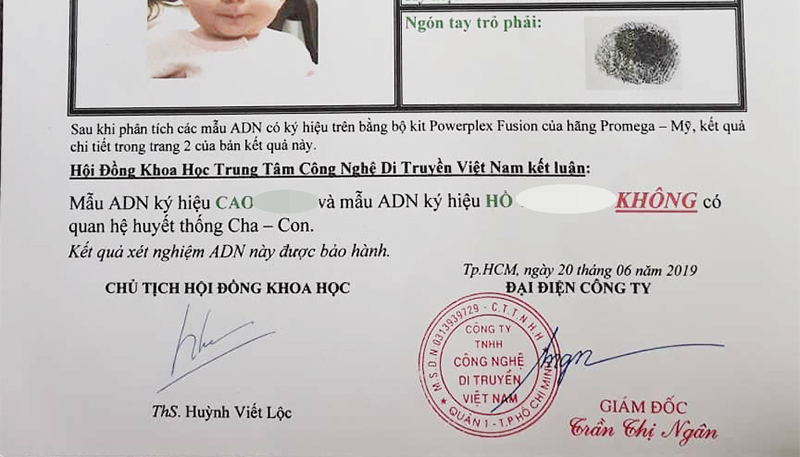 Theo kết quả xét nghiệm của Trung tâm công nghệ di truyền Việt Nam, mẫu ADN của anh C.N .(con trai bà H.) và bé gái con nuôi của nữ Chủ tịch phường 9, TP Cà Mau không có quan hệ huyết thống cha - con.