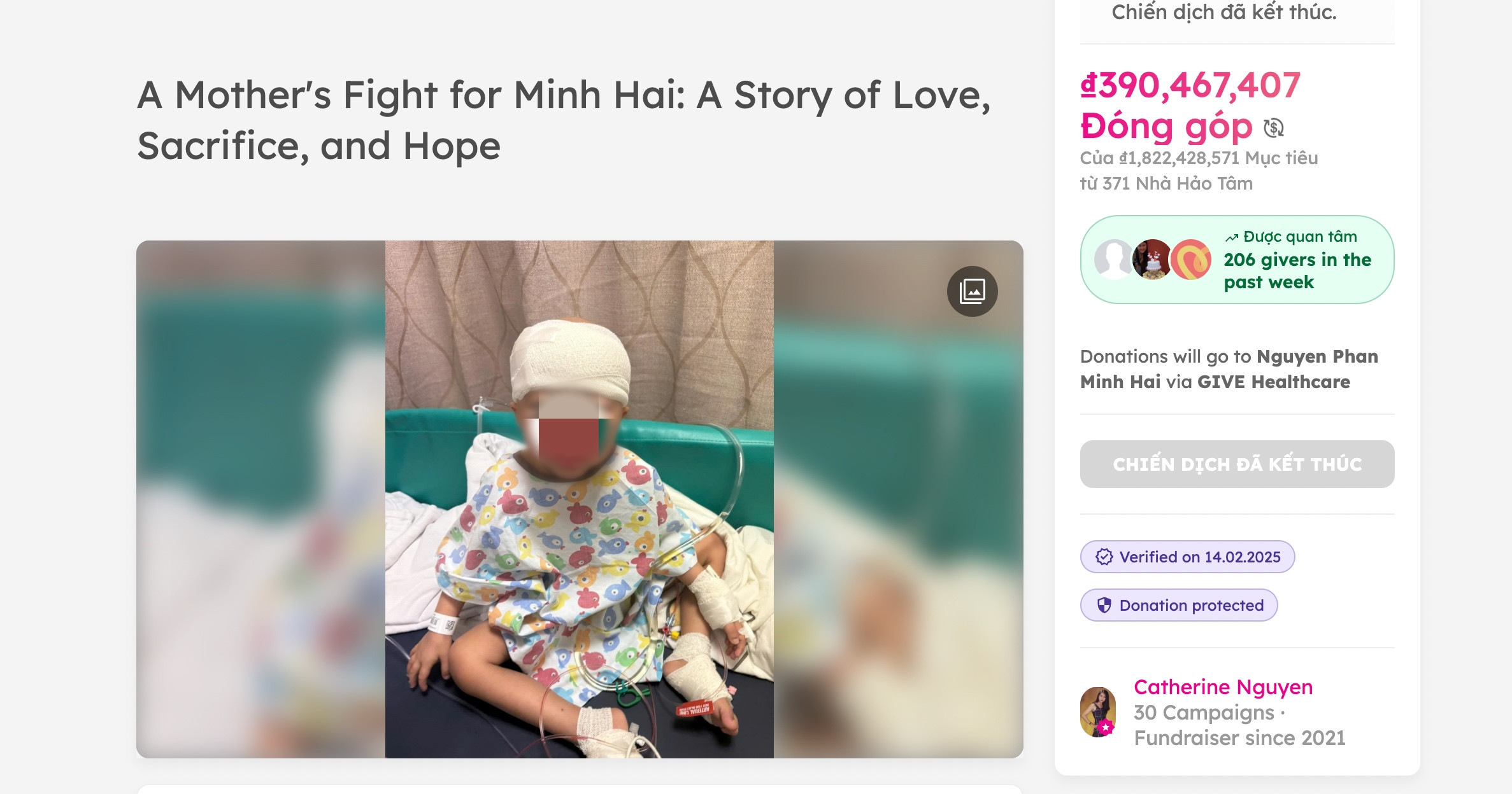 Tuy nhiên, sau buổi phát sóng, khi các thắc mắc về tính minh bạch tài chính chưa được giải đáp, chị H. lại liên tục đăng tải hình ảnh con trai đang được điều trị tích cực. Đáng chú ý, khi lượng người theo dõi trang cá nhân chị này tăng nhanh, lời kêu gọi quyên góp cùng thông tin tài khoản ngân hàng vẫn được ghim ở đầu trang.