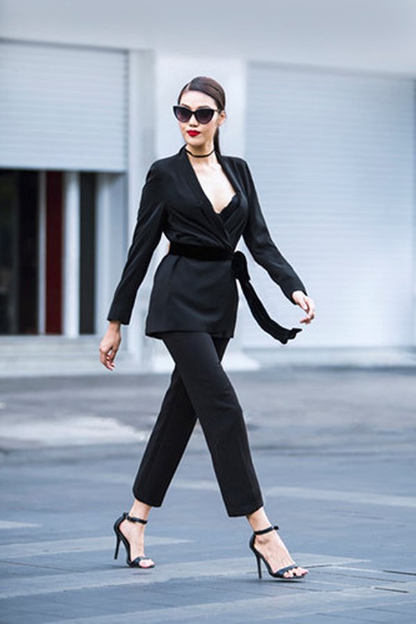 Có thể khẳng định, thật chẳng mấy khi người ta mới được trông thấy người đẹp sinh năm 1989 thay đổi hoàn toàn phong cách thời trang thế này. Mới hôm trước còn diện váy voan bồng bềnh màu hồng nữ tính, thế mà hôm nay Trương Quỳnh Anh đã hóa quý cô sành điệu trong cây đồ đen mang thiết kế cực cá tính. Từ chiếc áo blazer dáng dài, chiếc quần da ống rộng, đến những món phụ kiện như kính râm, khuyên tai vòng to bản, tất cả đã đem tới một tổng thể phong cách người đẹp chuẩn cool ngầu.