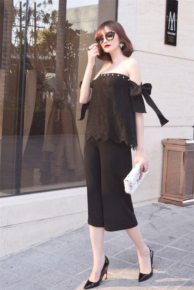 diện áo trễ vai cùng quần culottes, khoe vòng một căng tròn cùng chân