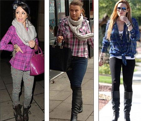 Cher Lloyd, Colleen Rooney và Lindsay Lohan bụi bặm với áo kẻ caro phốicùng quần bó và bốt cao cổ.