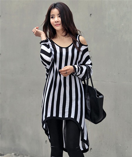 Áo kiểu high low lạ mắt với các đường kẻ lớn nhỏ xen kẽ rất phù hợp với những cô nàng ưa thích sự độc đáo.