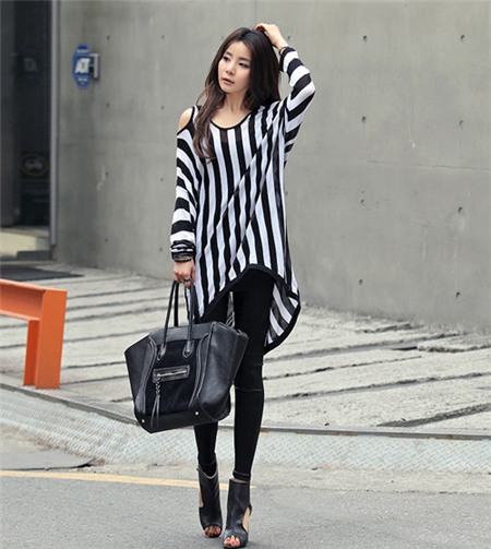 Trẻ trung và không kém phần gợi cảm với quần legging và áo thun dáng dài có họa tiết kẻ sọc.