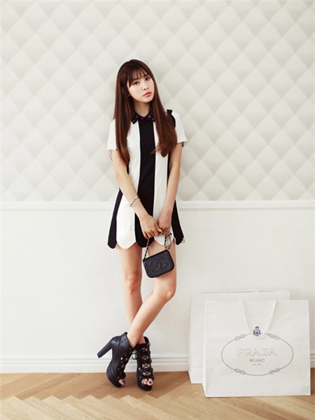 Thành viên Yoobin của nhóm nhạc nữ Wonder Girls gợi cảm với chiếc đầm kẻ đen trắng siêu ngắn.