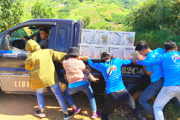| “Nhiều nơi xe bị sa lầy đi không nổi là tụi em xuống đẩy, có nơi đường sá chật hẹp thì tụi em bốc xếp hàng liên tục từ xe tải lớn xe ba gác luôn. Lắm khi đường sá gian nan nhưng khi đến nơi thấy nụ cười của bà con thì bao nhiêu vất vả tan biến hết.”, anh Vĩnh Hải (nhân viên Điện Máy Xanh khu vực miền Tây) chia sẻ. |