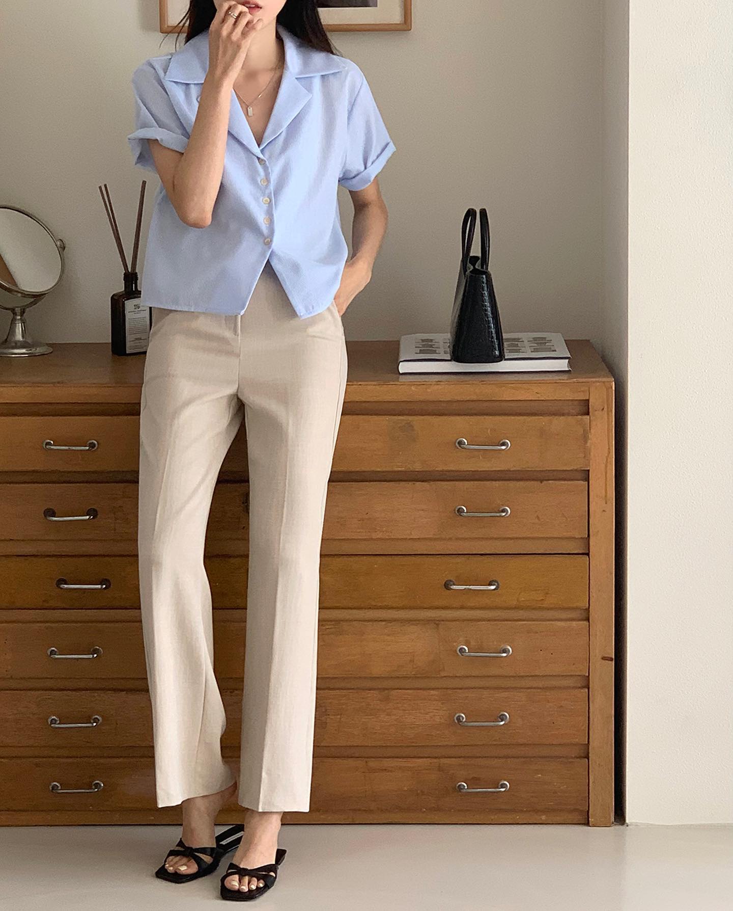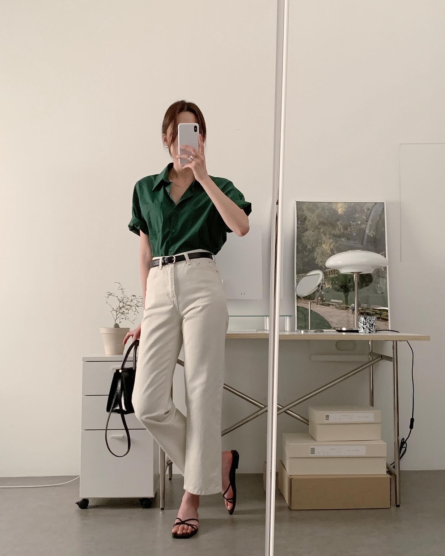 Công thức trên cho hiệu quả "hack" tuổi nhờ mẫu áo sơ mi cộc tay tông màu xanh pastel, và quần ống đứng, màu trắng kem. Phom dáng lửng của chiếc áo sơ mi cộc tay giúp bạn không cần sơ vin, mà tổng thể vẫn cao ráo. Túi xách và giày dép mang tông màu đen sẽ đảm bảo sự trang nhã cho set trang phục.