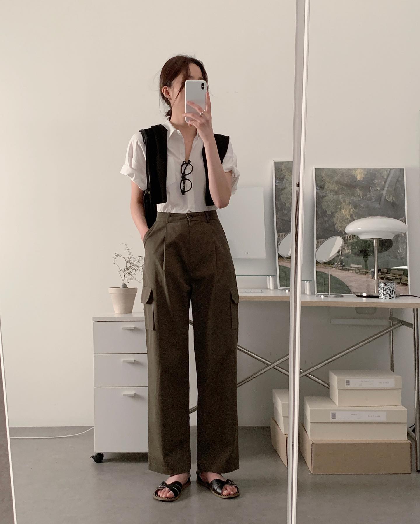 Các nàng có thể tạo sự phá cách cho thời trang công sở với quần túi hộp, ống đứng. Mẫu quần này kết hợp ăn ý với áo sơ mi trắng, giúp bạn hoàn thiện bộ trang phục cá tính, năng động. Nhờ thao tác sơ vin mà dù đi sandal đế bệt, vóc dáng của người diện vẫn cao ráo.