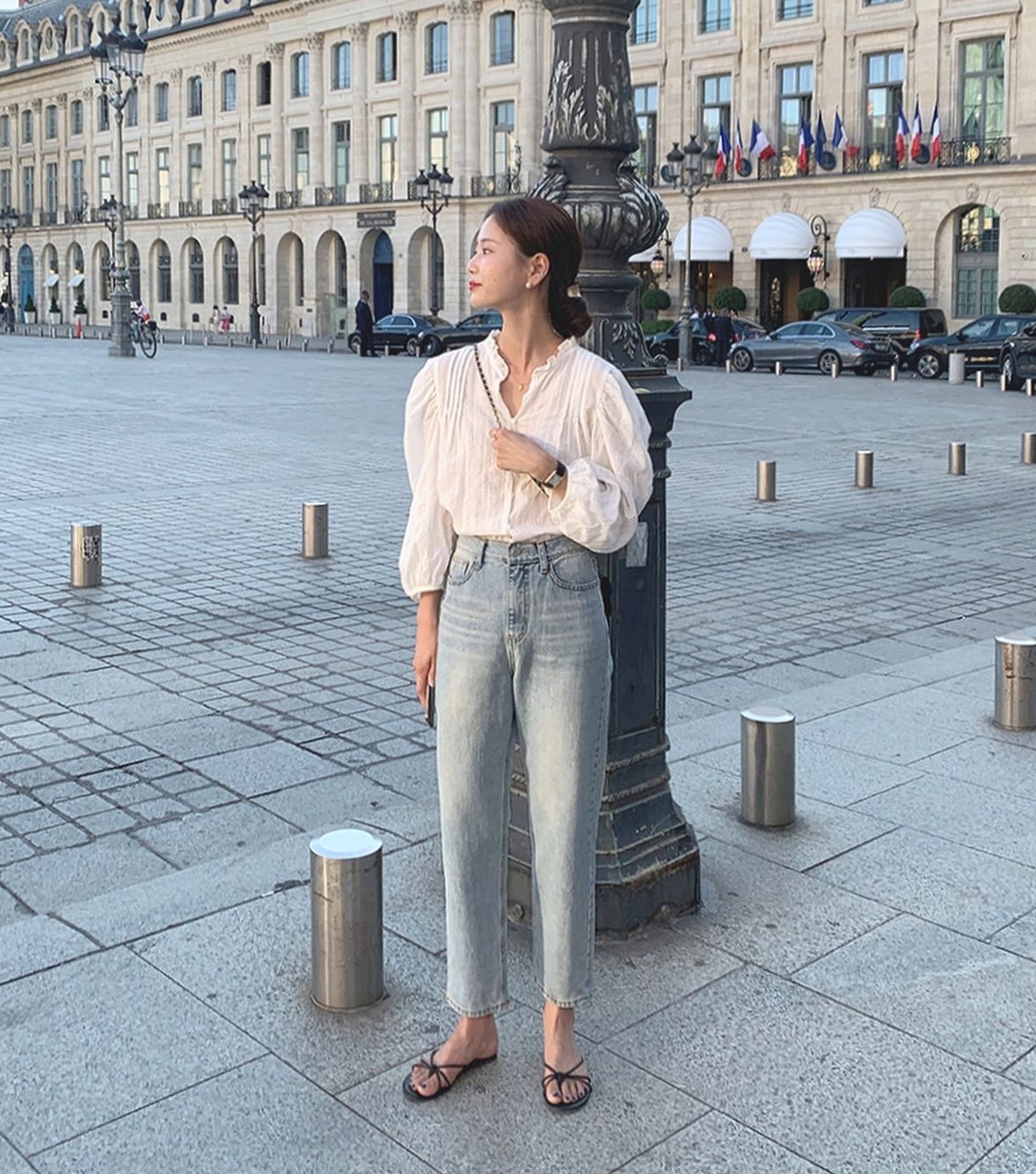 Áo blouse trắng và quần jeans ống đứng là công thức ai cũng có thể mặc đẹp. Bộ trang phục này nữ tính, trẻ trung. Để bộ cánh trở nên thanh lịch, đúng chất công sở hơn, chị em đừng quên sơ vin gọn gàng.