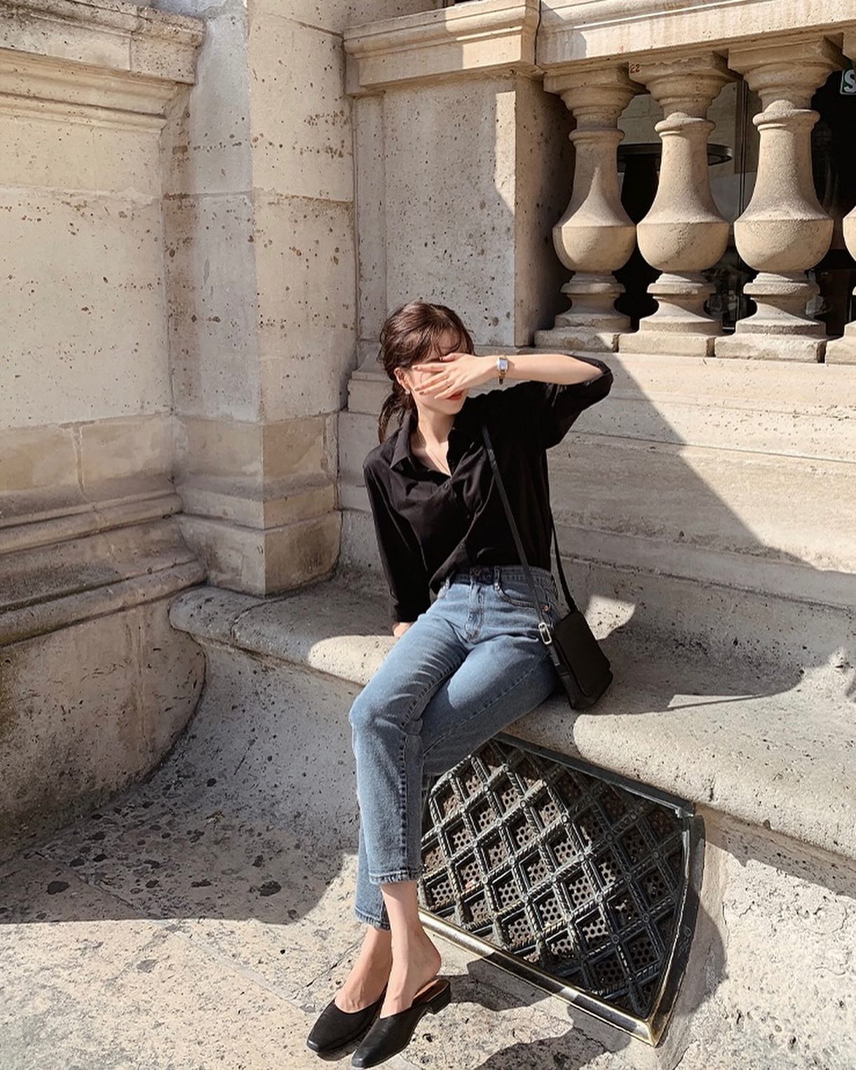 Làm thế nào để "hack" tuổi khi diện áo sơ mi tông màu đen? Câu trả lời là chị em hãy kết hợp mẫu áo cùng quần jeans ống đứng, bộ trang phục sẽ trở nên trẻ trung, năng động hơn. Bên cạnh đó, độ thanh lịch của set trang phục vẫn được giữ nguyên, đặc biệt là khi bạn đi giày mule và đeo túi xách tông màu trung tính.