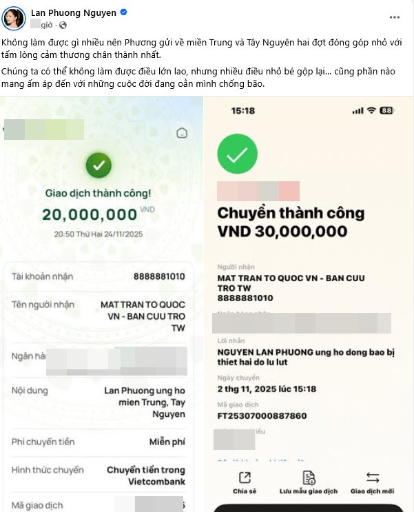 Mới nhất, diễn viên Lan Phương có chia sẻ trên trang cá nhân. Nữ diễn viên chia sẻ hai màn hình chuyển khoản ủng hộ với tổng số tiền lên đến 50 triệu đồng cho Mặt trận Tổ quốc Việt Nam - Ban cứu trợ Trung ương từ đầu tháng đến nay.