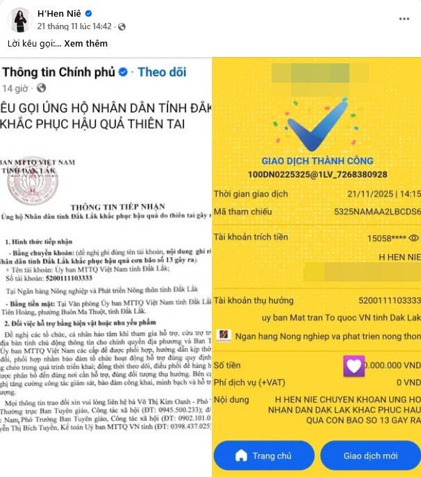 Ngoài Lan Phương, hoa hậu H'Hen Niê cũng có hành động ủng hộ bà con chịu ảnh hưởng mưa lũ. Được biết, quê nàng hậu cũng ở Đắk Lắk - một trong những tỉnh chịu thiệt hại nặng nề do thiên tai. H'Hen Niê chia sẻ hình ảnh chuyển khoản nhưng bí mật về số tiền.