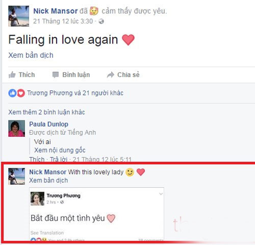 Ngay khi bắt đầu hẹn hò, Trương Phương và Nick Mansor đã đăng tải trạng thái “đang yêu” và công khai tag Facebook của nửa kia trên trang cá nhân.