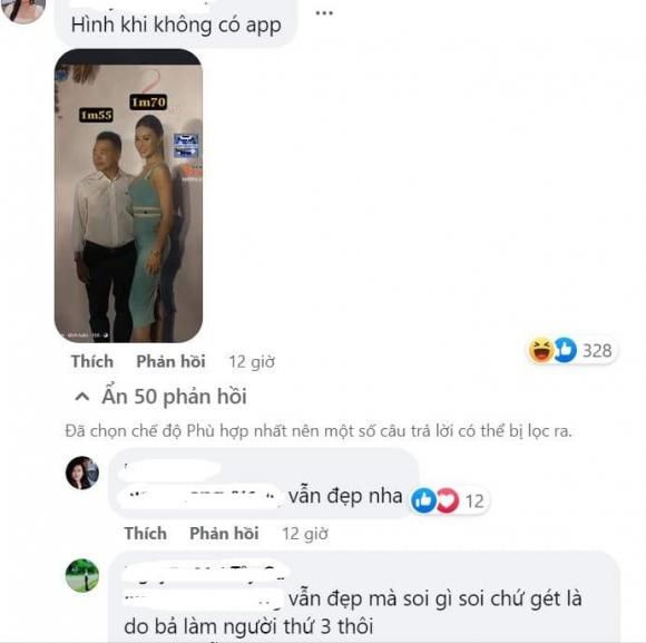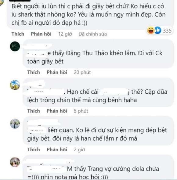 Đáng nói, bên dưới bình luận cư dân mạng còn chia sẻ và bàn tán việc Phương Oanh và Shark Bình đứng gần nhau, để lộ sự chênh lệch chiều cao rõ ràng. Dù có sự chênh lệch rõ ràng về ngoại hình nhưng nhiều cư dân mạng cho rằng trên thực tế Shark Bình phải cao khoảng từ 1m6 đến dưới 1m7, còn Phương Oanh là 1m7. Thêm vào đó nữ diễn viên đi giày cao gót nên mới có sự chênh lệch lớn tới vậy.