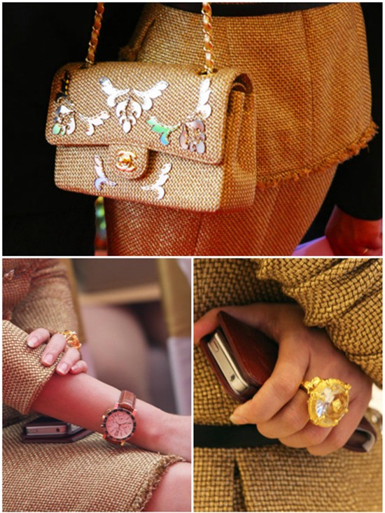 của Chanel phối cùng hoa tai, đồng hồ, vòng tay, nhẫn đính kim cương