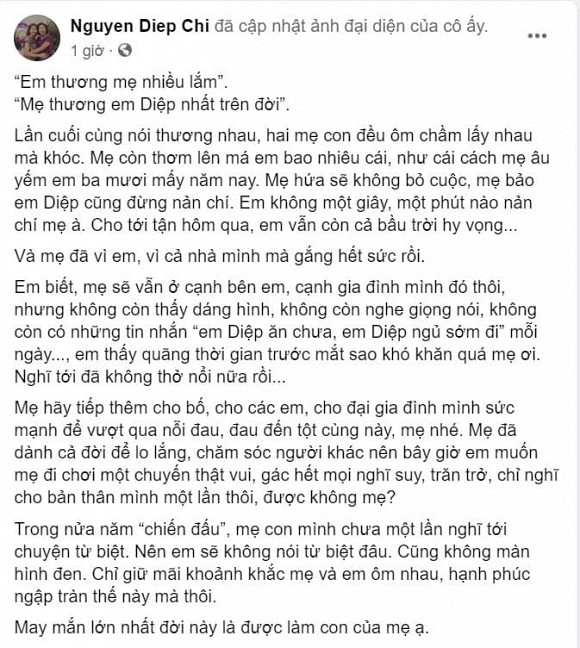 "Em biết, mẹ sẽ vẫn ở cạnh bên em, cạnh gia đình mình đó thôi, nhưng không còn thấy dáng hình, không còn nghe giọng nói, không còn có những tin nhắn "em Diệp ăn chưa, em Diệp ngủ sớm đi" mỗi ngày..., em thấy quãng thời gian trước mắt sao khó khăn quá mẹ ơi. Nghĩ tới đã không thở nổi rồi...