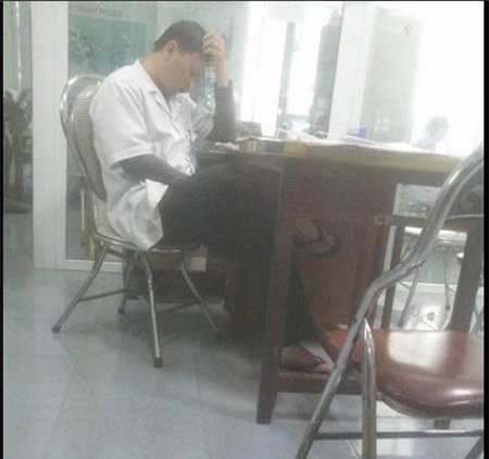 trong khi mọi người chờ đợi suốt nhiều giờ thì điều dưỡng này lại ngồi